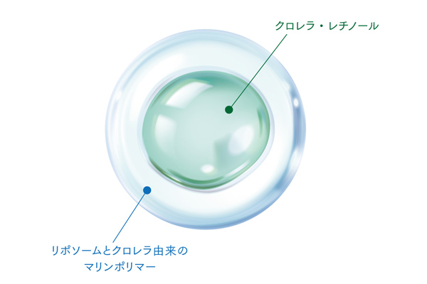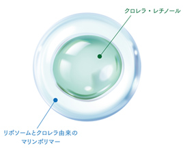 クロレラ・レチノール(アポカロテノイド)はクロレラ由来のマリンポリマーとリポソームが結合したカプセルに包み込まれています。この独自のカプセルにより、バリア機能を壊さずに角質層の奥深くまでクロレラ・レチノールを浸透させることが可能になりました。