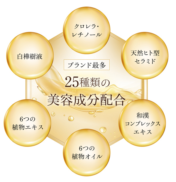 ブランド最多となる25種類の美容成分を配合。8種類の伝統和ハーブ、6種類の植物オイル、5種類の植物エキス など大人の肌に嬉しい成分を贅沢に注ぎ込みました。25種類のサポート力で、密度のあるハリ・濃密なうるおいをもたらします。