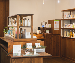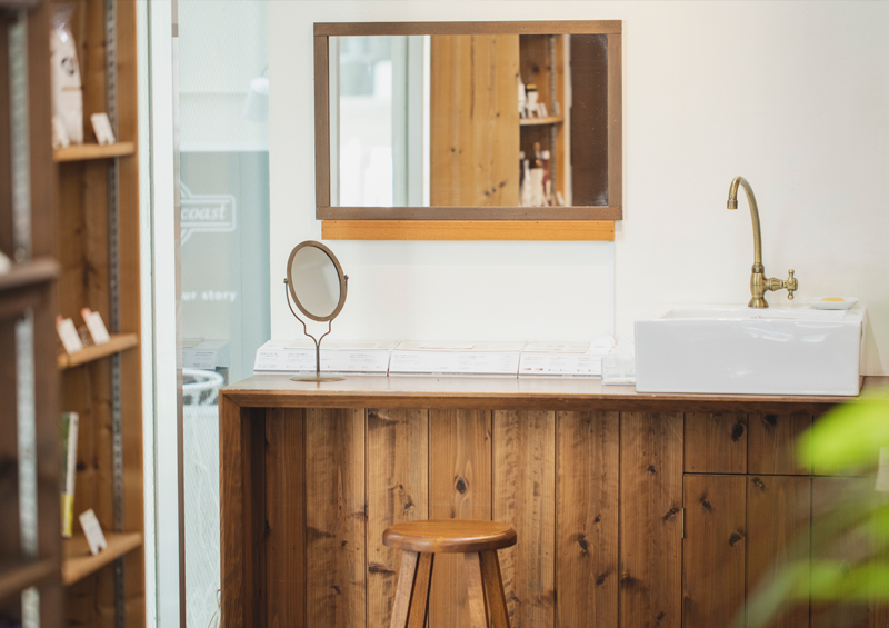 店内の内装で使用している木材はすべて国産無垢材で、塗料は亜麻仁油やえごま油、酸化鉄を用いた自然塗料です。表参道店では、太陽光や風力などの自然エネルギーによって発電されたグリーン電力100%で運営。森の中にいるような、深呼吸したくなる空間で、私たちスタッフも癒されています。