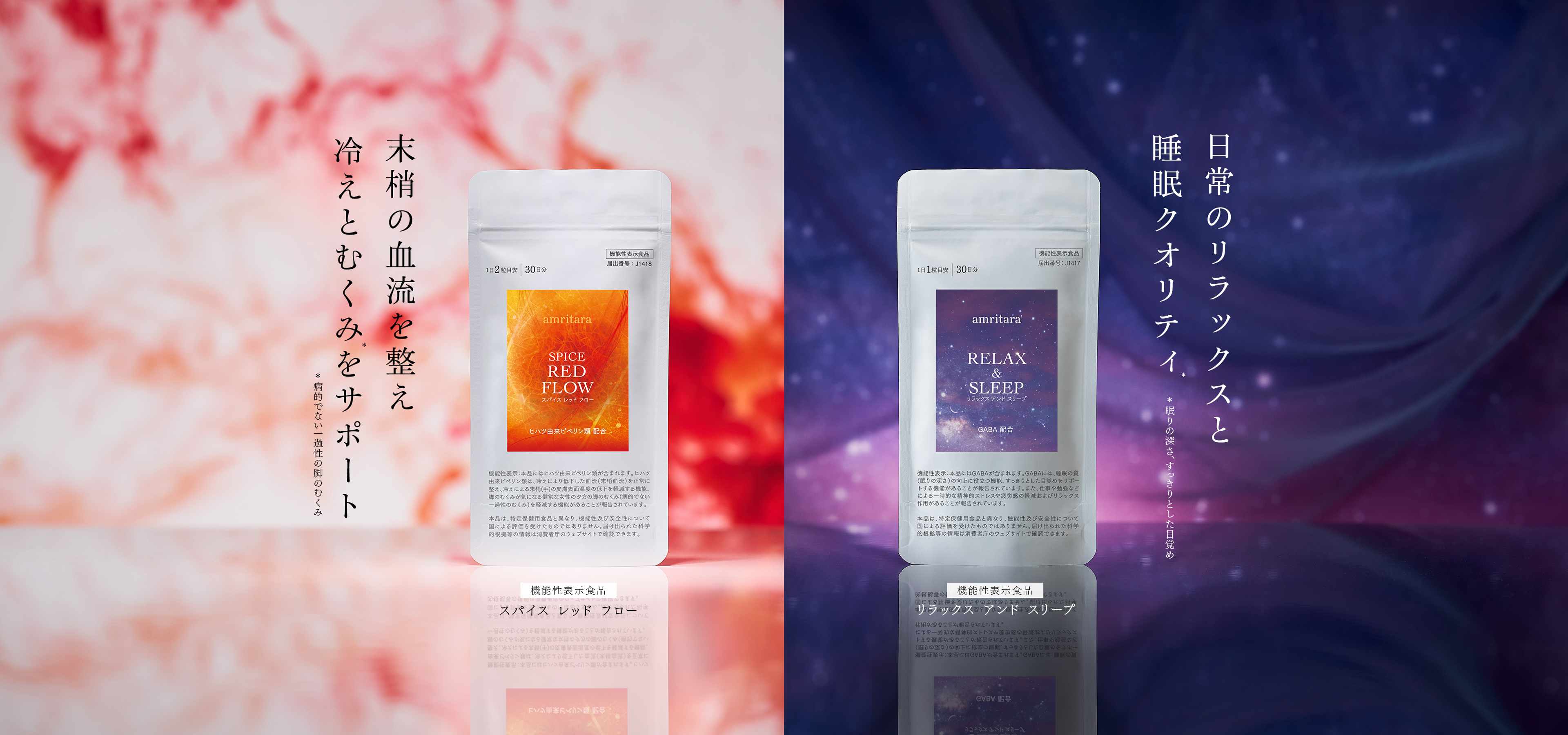 そこでアムリターラでは、機能性関与成分を配合した2つのサプリメントを開発。日中はヒハツ由来ピペリン類の力で、夜はGABAの働きで健やかな毎日をサポートします。