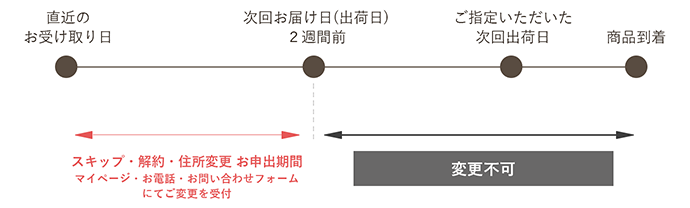 ※5回目以降のお休み(スキップ)・解約・出荷日に関するご相談は、マイページ・お電話・お問い合わせフォームにて承ります。直近のご配送分をお受け取り後、次回「お届け日(出荷日)」の2週間前までにお申し出ください。数量については、マイページから変更ができないため、次回「お届け日(出荷日)」の2週間前までにお問い合わせフォームまたはお電話にてご依頼ください。