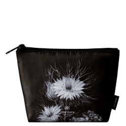 色香漂う漆黒のポーチの中心に描かれているのは、バームに配合している「ニゲラ・サティバ(ブラックシード)」です。ニゲラ・サティバの周りにはローズゼラニウムやサンザシが、ポーチの裏面にはカモミールやヤマザクラ、クロヨナ、クロモジ、柿の花が咲き誇り、アムリターラらしいボタニカルなアートをお楽しみいただけます。