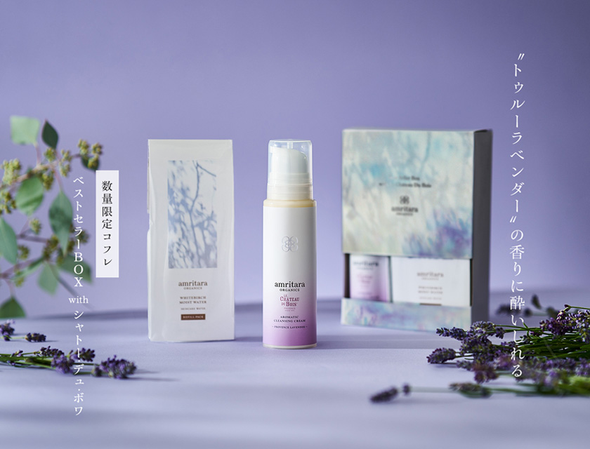 フランスのオーガニックコスメブランド「シャトー·デュ·ボワ」のトゥルーラベンダー*1の精油を配合した「アロマティック クレンジング クリーム」と、ブランド売上No.1*2を誇る高保湿化粧水「ホワイトバーチ モイスト ウォーター」のレフィルをセットにしました。ひときわ華やかで芳醇なラベンダーのクレンジングをお楽しみいただけます。